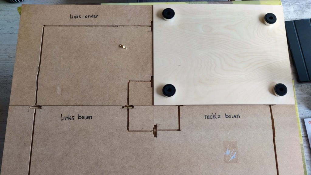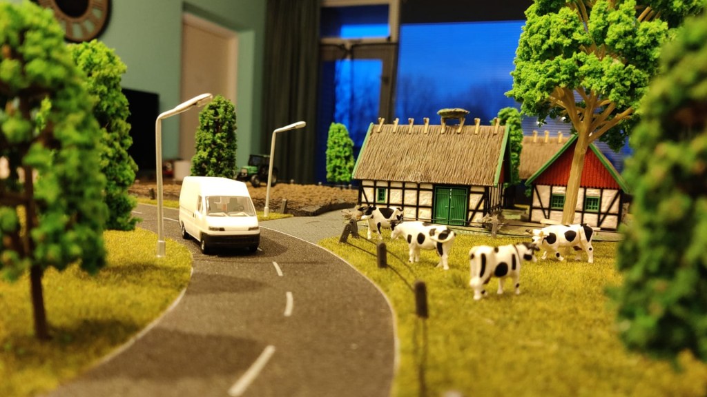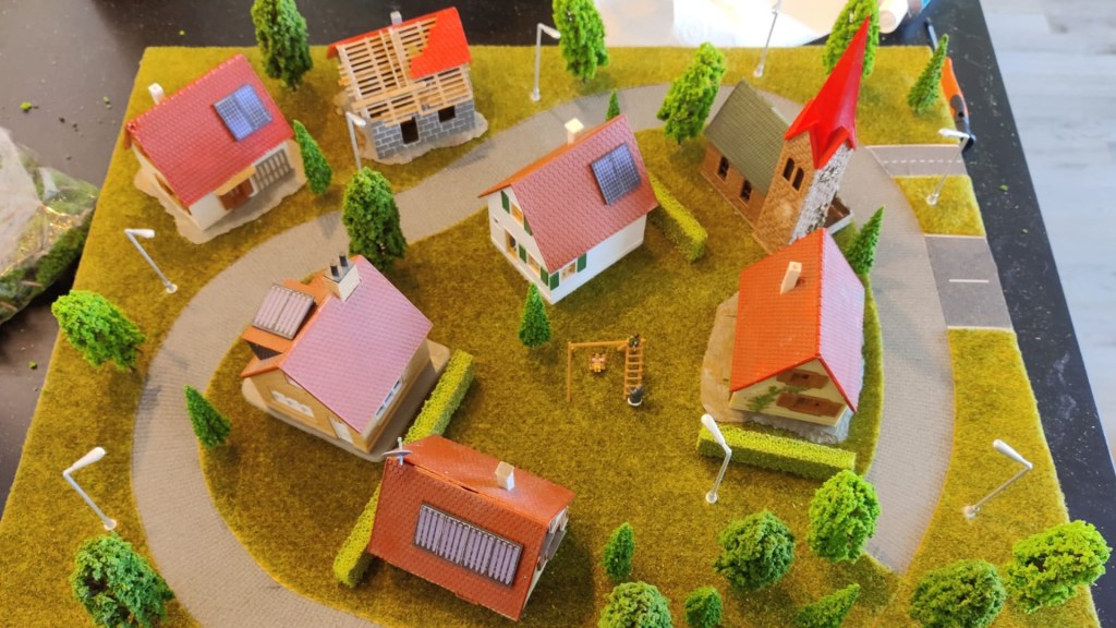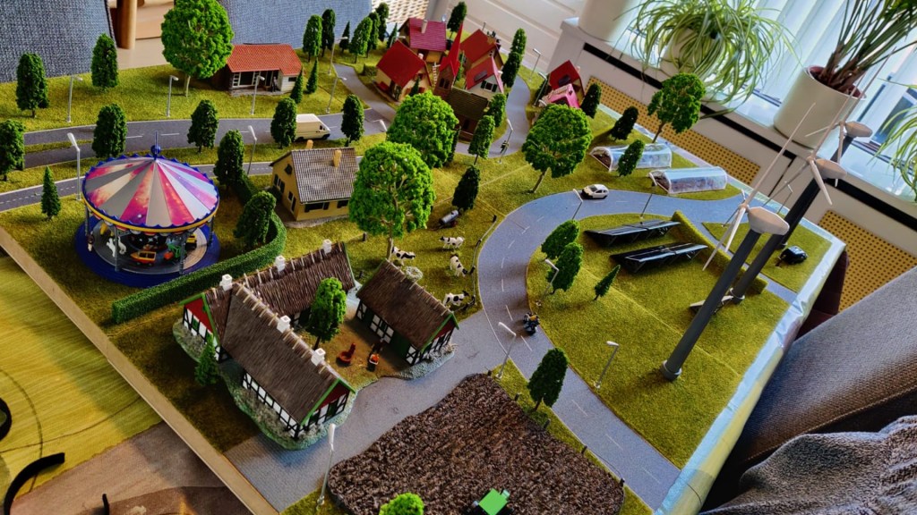 Met een handfrees werden de kabelgeulen zorgvuldig in de houten basisplaten gefreesd, waardoor de bedrading netjes weggewerkt kon worden. De elektronica, zoals verlichting in de huisjes, straatverlichting, en zonnecellen, is stevig door de basisplaten heen bevestigd. Elk element – van draaiende windturbines tot zonnepaneel-aangedreven kassen – is met oog voor detail geïntegreerd om een functioneel en visueel aantrekkelijk geheel te creëren. Dit uitgebreide maakproces resulteerde in een interactieve installatie die zowel duurzaam als educatief is.